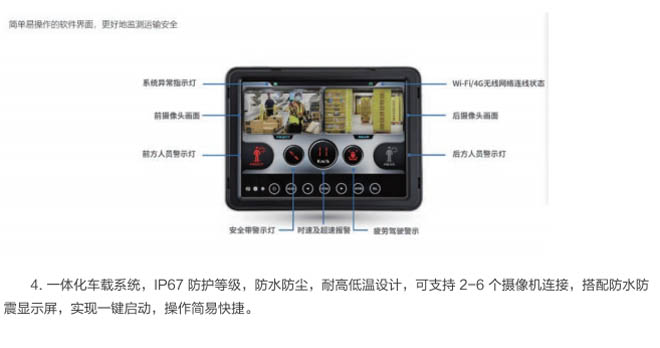 4.智能集成化設(shè)計(jì),一鍵開啟車載系統(tǒng),AI精準(zhǔn)識(shí)別、人車防撞、車車防撞、盲區(qū)防撞等。